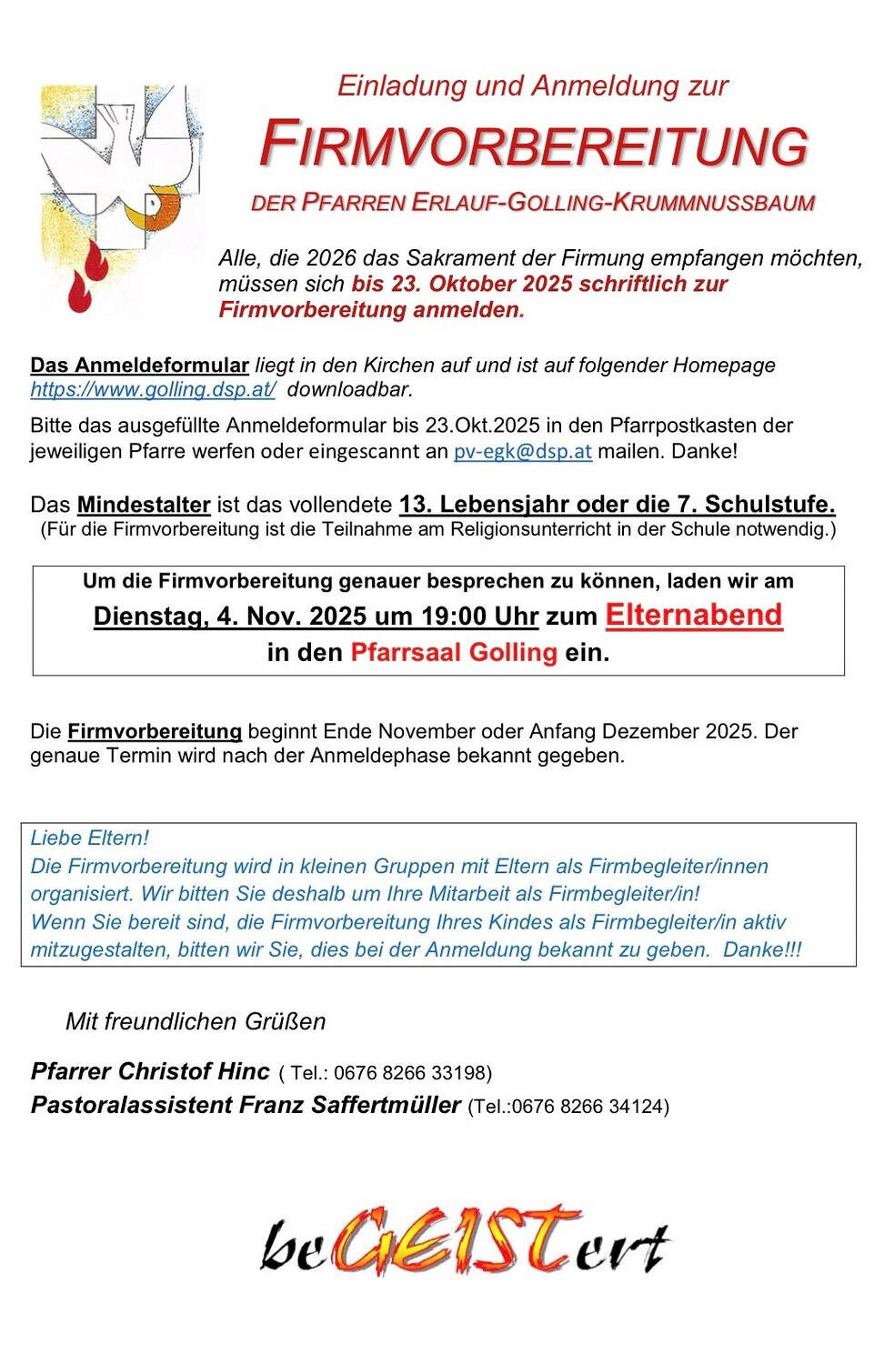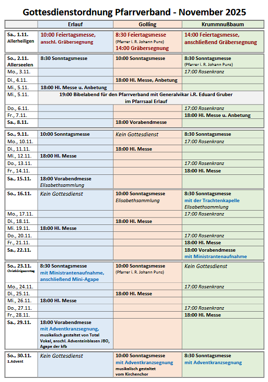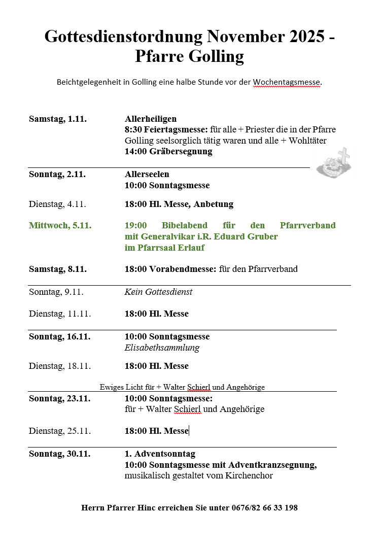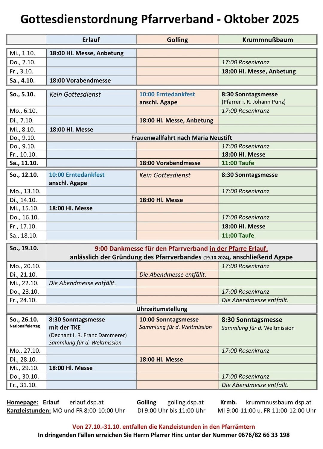 Von 27.10.-31.10. entfallen die Kanzleistunden im Pfarramt. In dringenden Fällen erreichen Sie Herrn Pfarrer Hinc unter 0676/82 66 33 198.